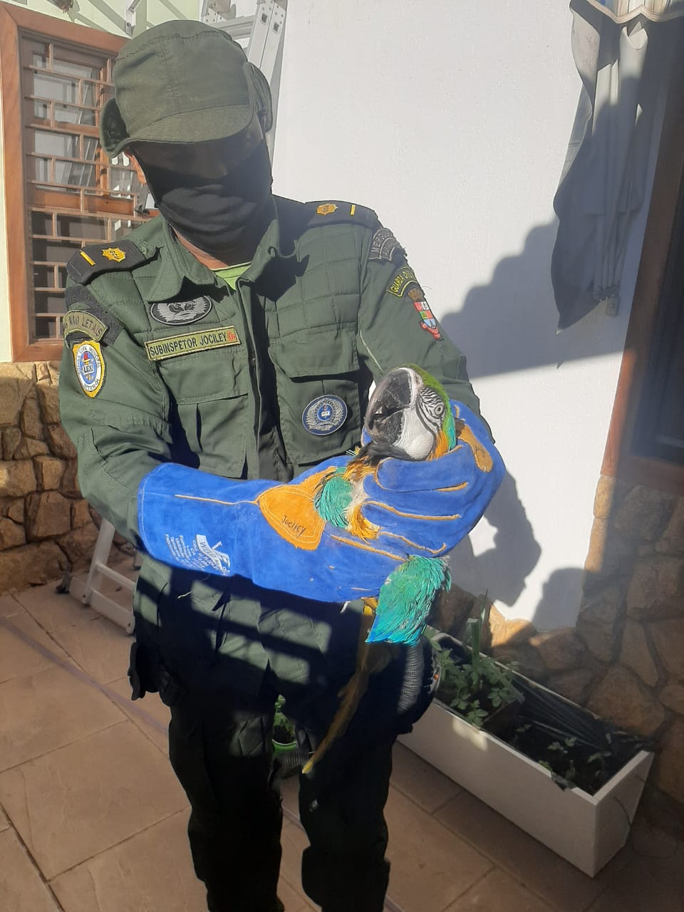 Os agentes foram acionados pelos próprios proprietários da casa através do número 153, que atende no Centro Integrado de Segurança Pública (Cisp). A arara não estava ferida e possui uma anilha na pata, o que significa, segundo os agentes, que o animal pode ter autorização de criação pelo Instituto Brasileiro do Ambiente e dos Recursos Naturais (Ibama) e provavelmente fugiu dos seus cuidadores.