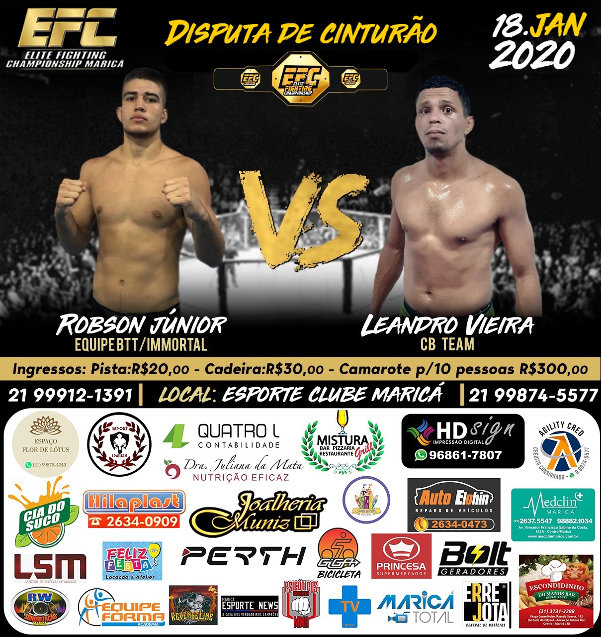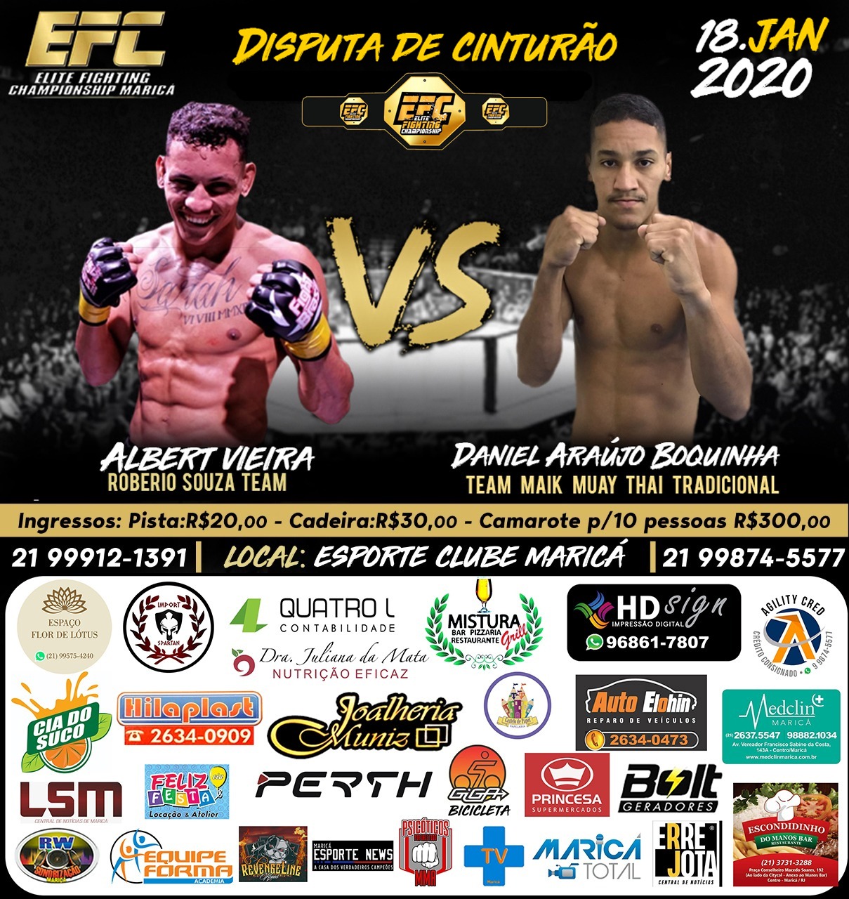 A sensação do MMA maricaense, Robson Júnior, e o atleta de Inoã Albert ‘Maldito’, disputarão os cinturões do Elite Fighting Championship (EFC), que conta com o apoio de mídia do ErreJota Notícias. O evento, que tem grande tradição na cidade, promete lotar o Esporte Clube Maricá (ECM) no próximo sábado (18).