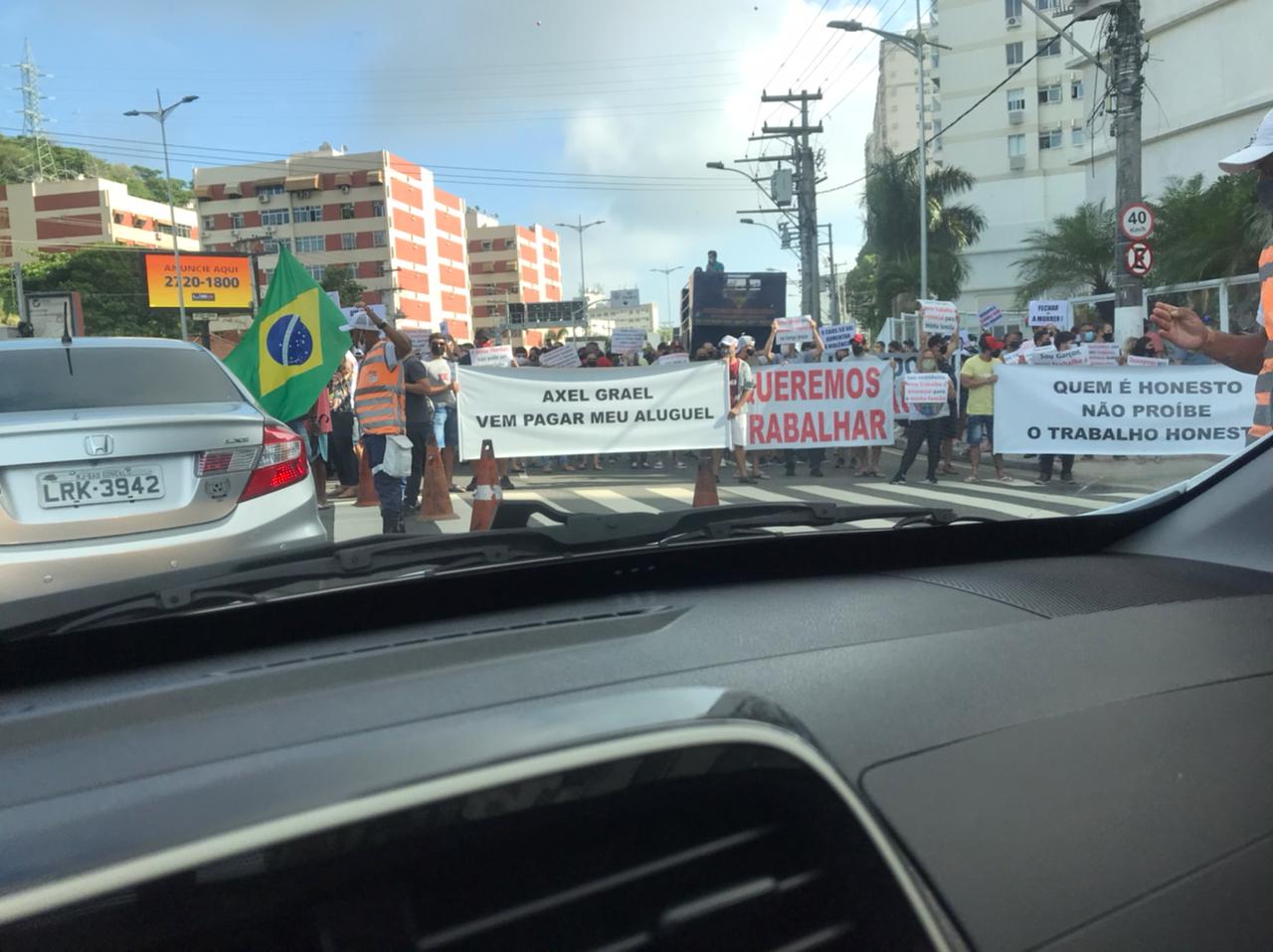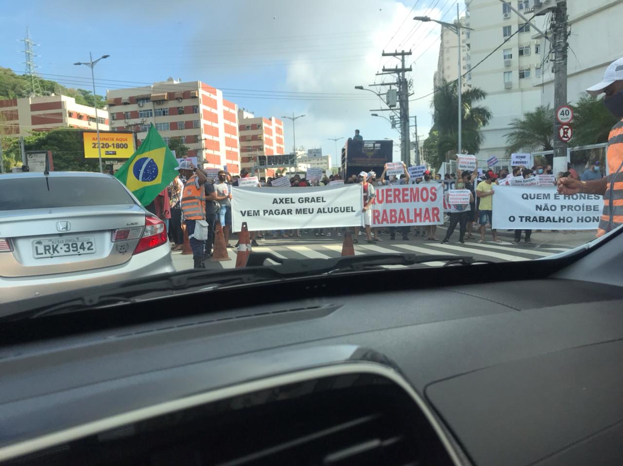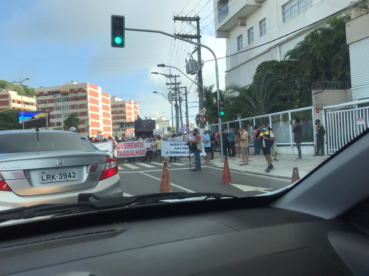 Manifestação – Pelo terceiro dia seguido, empresários e comerciantes realizam uma manifestação pela reabertura do comércio na cidade. A ação provocou caos no trânsito e atrapalhou a vida dos motoristas que seguiam da Zona Sul e Região Oceânica em direção ao Centro da cidade.