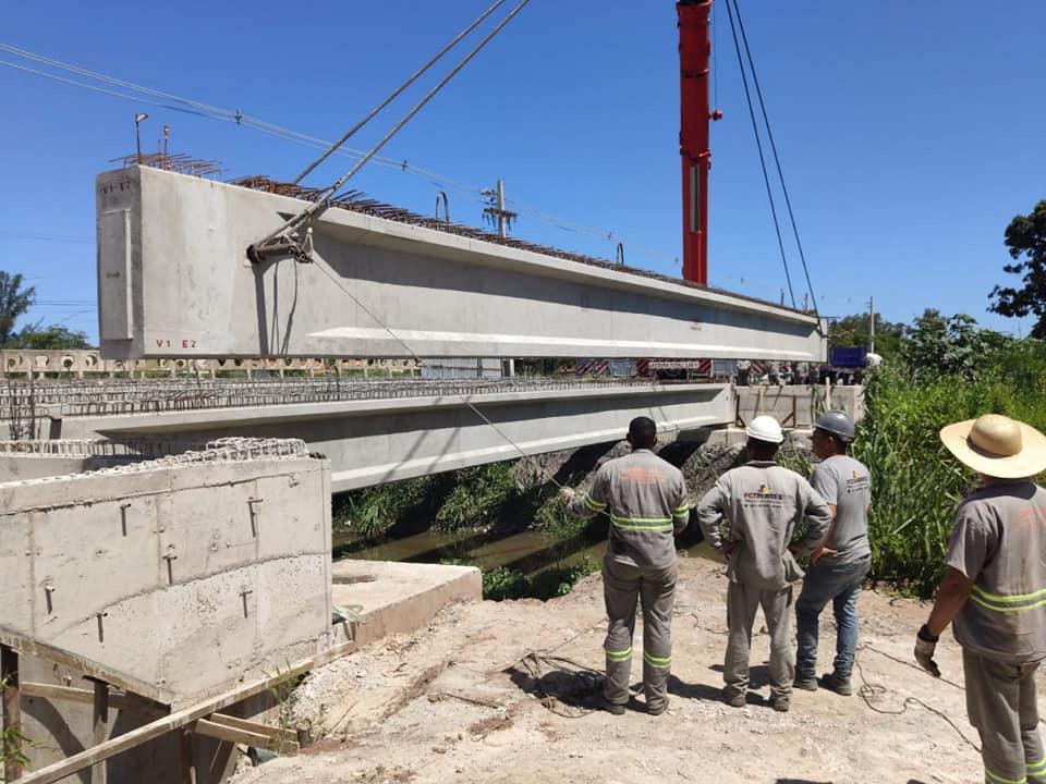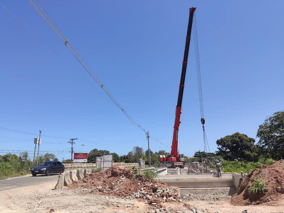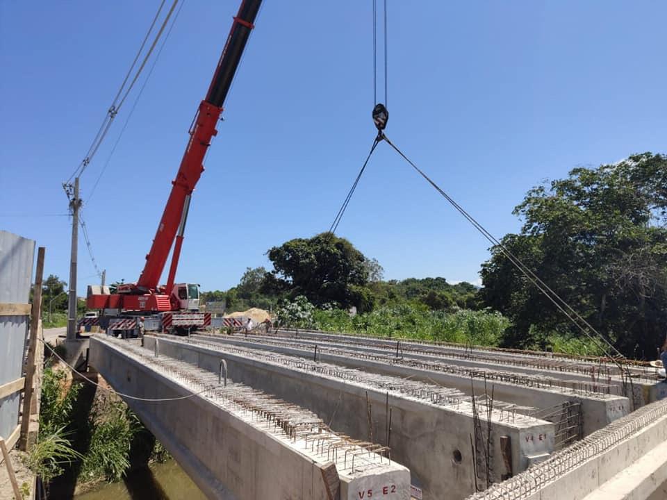 A última das cinco vigas que irão compor o piso da nova ponte da Estrada dos Cajueiros, sobre o Rio Bambu, foi instalada no início da tarde desta quarta-feira (11). A previsão é que a ponte, com cerca de 26 metros de comprimento e 13 de largura, fique pronta até meados de abril.