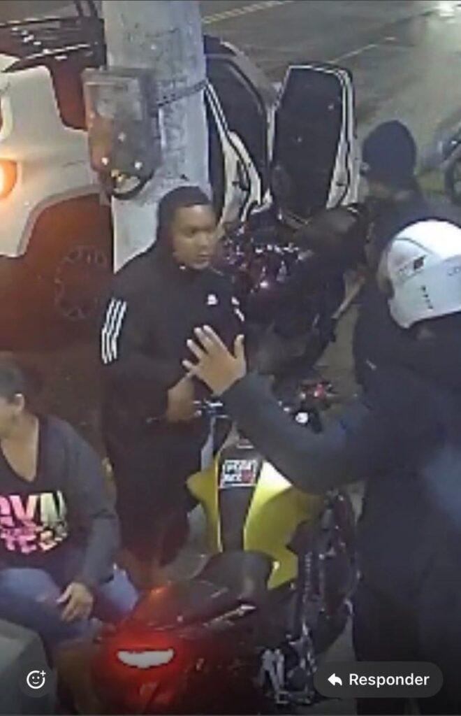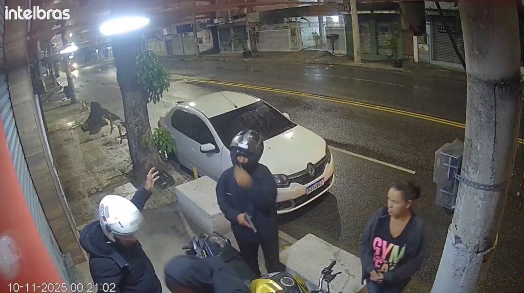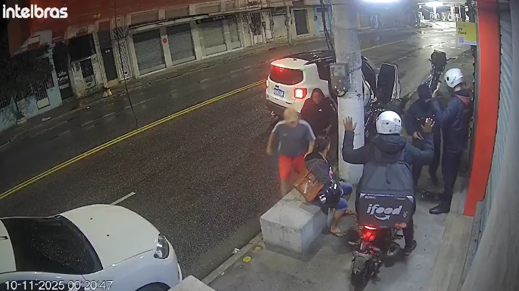 As imagens mostram dois motoboys e uma mulher conversando na calçada quando um carro branco para repentinamente na via. Três homens descem do veículo — um deles armado e vestindo roupas pretas com capuz — e anunciam o assalto.