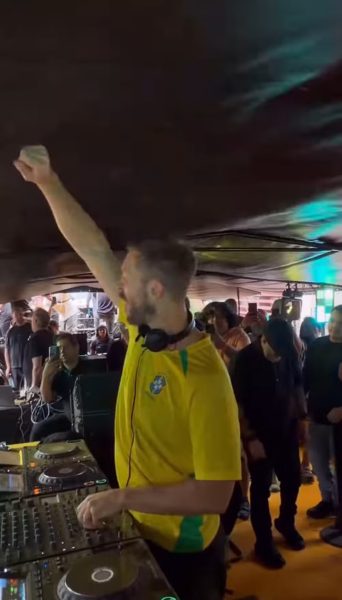 O DJ escocês Calvin Harris foi a principal atração de um bloco realizado na Rua da Consolação, em São Paulo. Usando camisa da seleção brasileira, ele apareceu no meio do público e foi escoltado por agentes da Guarda Civil Metropolitana.