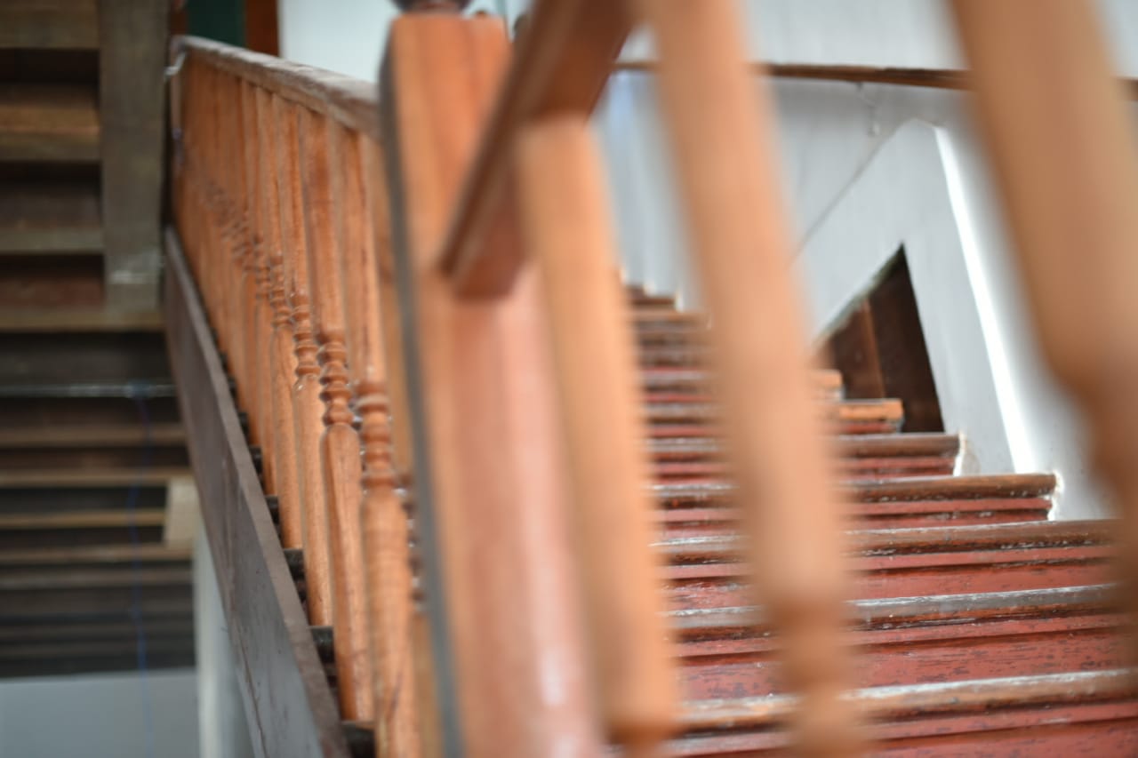 O corrimão da escada, feito em concreto, não era original. Então, a equipe o desmontou e fez uma escada flutuante para colocar no local, com barrotes de 7 metros de comprimento. Já os degraus originais foram mantidos. Outra intervenção quase artesanal ocorreu nas fechaduras das portas principais.