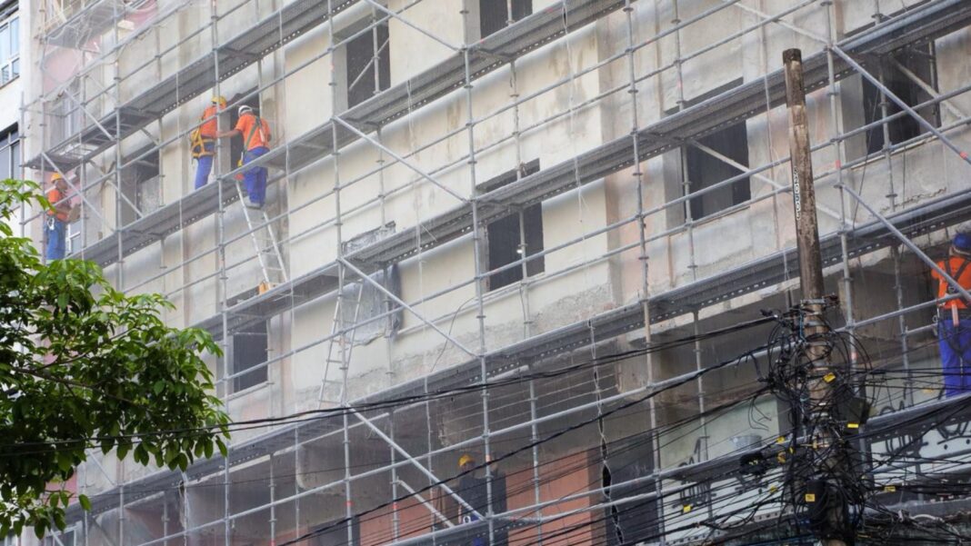 Nos pavimentos superiores, as antigas divisões internas foram demolidas para dar lugar a novos ambientes. Estão em execução a instalação dos sistemas hidráulicos e a preparação das estruturas metálicas que sustentarão as novas lajes. O reforço estrutural do imóvel já foi finalizado.