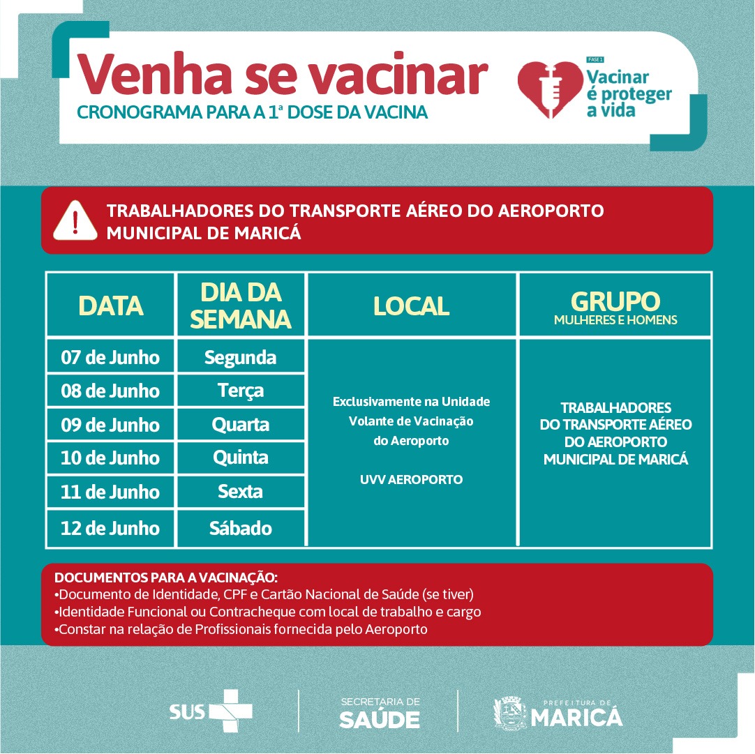 A Prefeitura de Maricá, através da Secretaria de Saúde, divulgou neste sábado (05/06) o cronograma de vacinação contra a Covid-19 no município vigente para o mês de junho. O atual calendário prevê a vacinação de pessoas sem comorbidades por faixa etária, população em situação de rua e trabalhadores do transporte aéreo do aeroporto municipal.