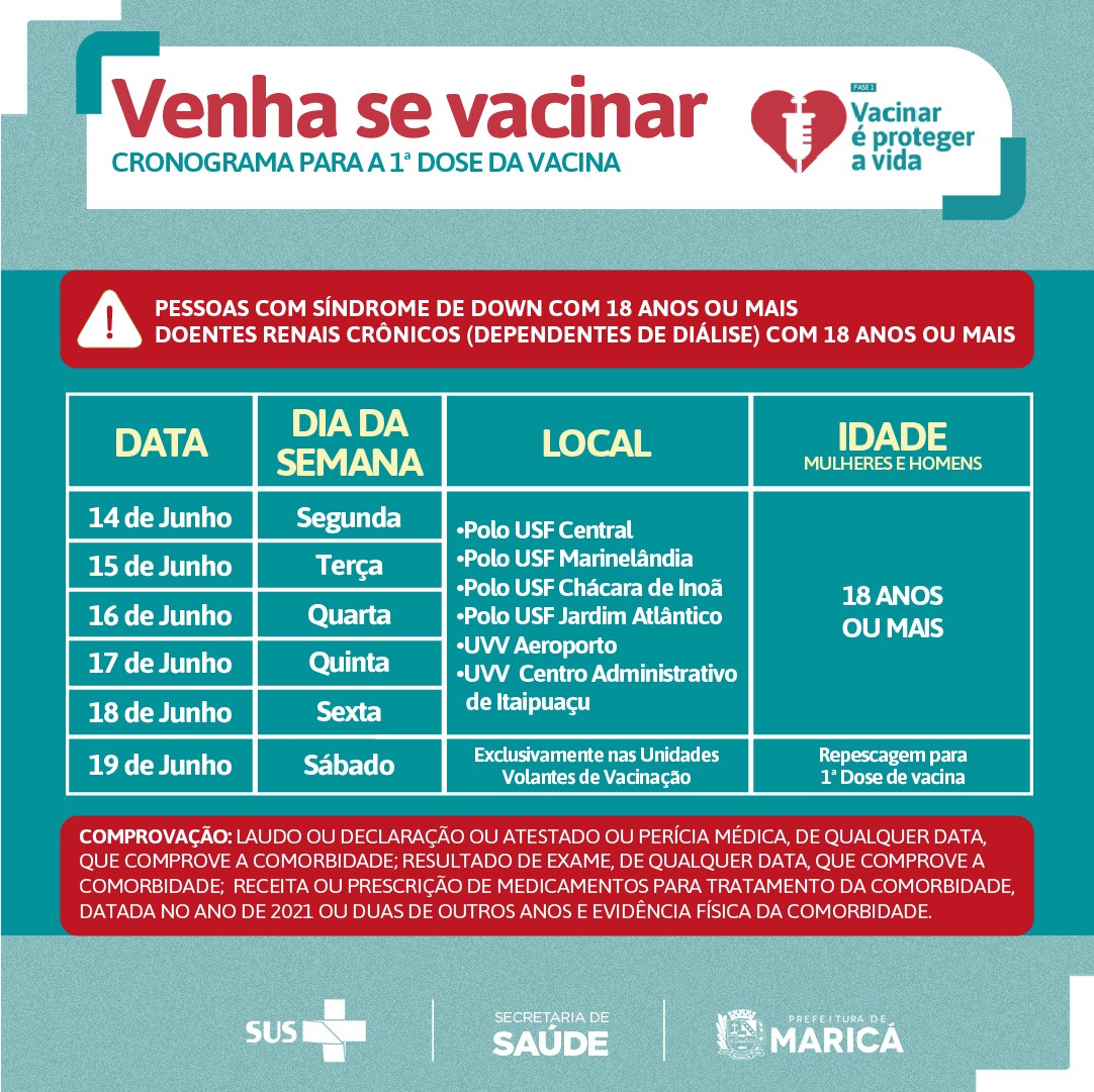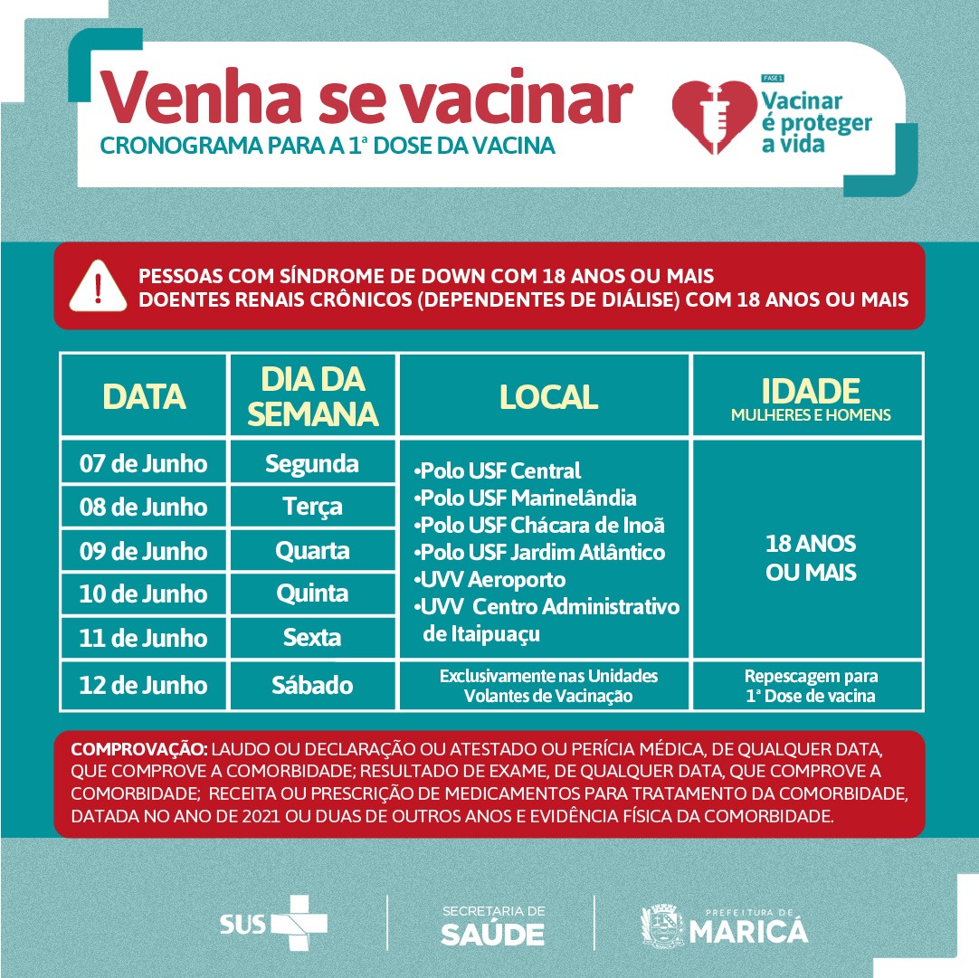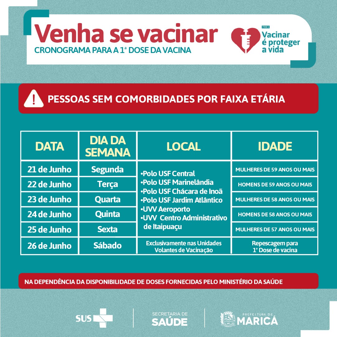 Permanecem no cronograma cidadãos com comorbidades e deficiências por faixa etária, além dos profissionais da educação pública e privada de Maricá. É importante destacar que aos sábados a vacinação contra a Covid-19 acontece exclusivamente nas unidades volantes de vacinação, inclusive com repescagem para a primeira dose da vacina.