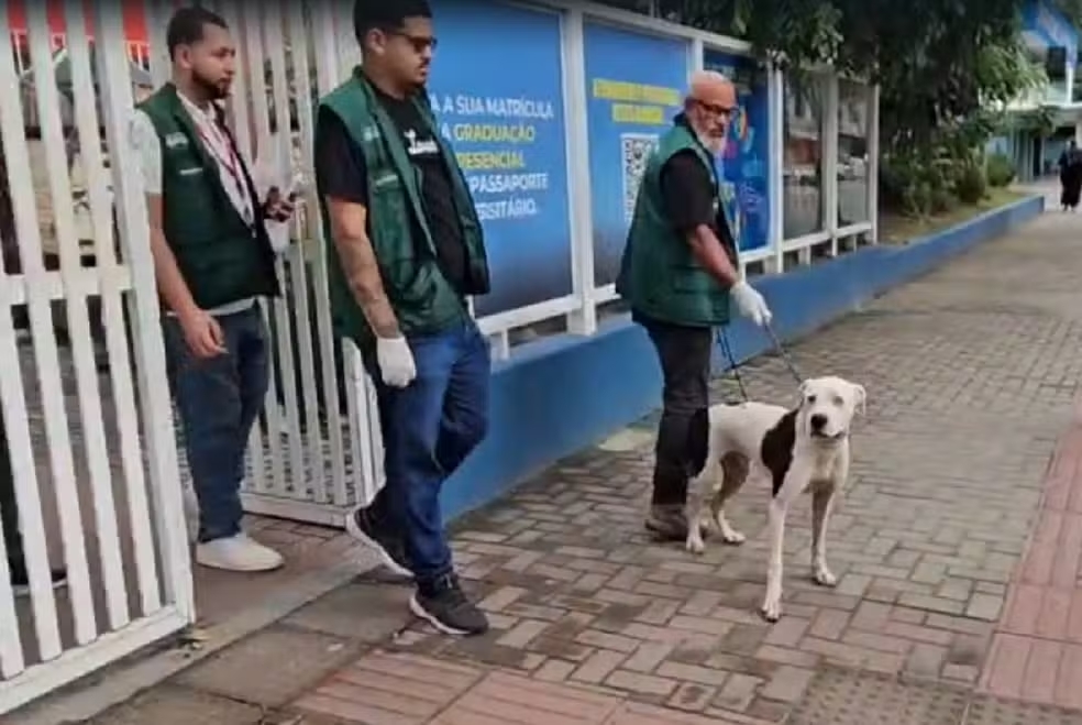 Equipes da Secretaria de Bem-Estar Animal estiveram na escola para dar suporte e investigar as circunstâncias do ocorrido. O cachorro foi resgatado.