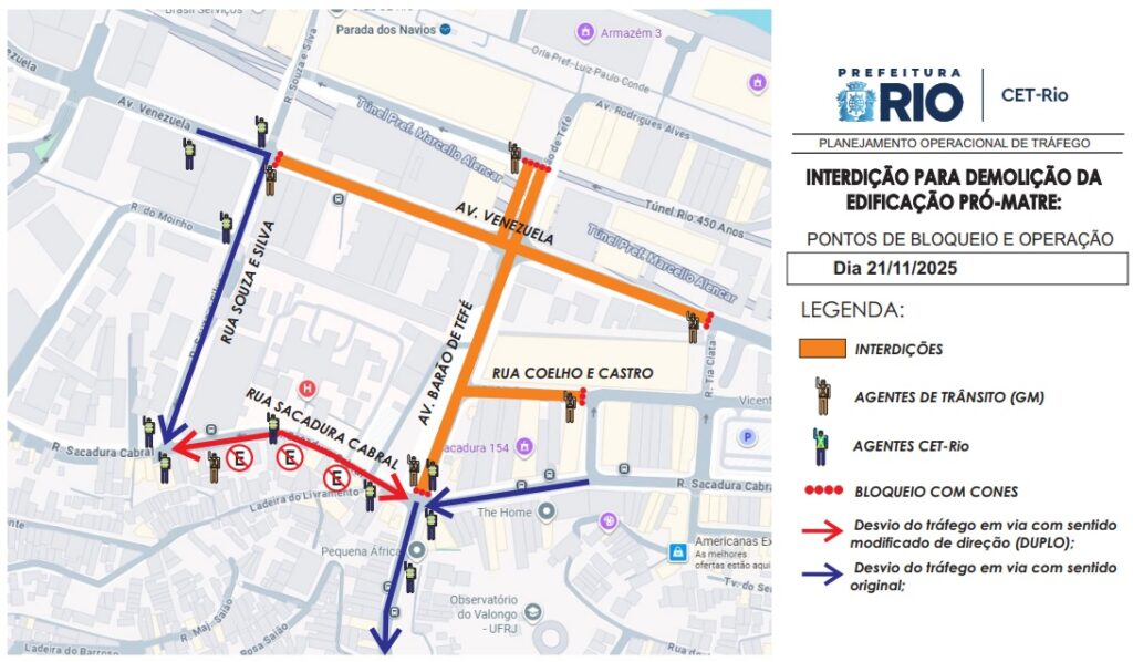A CET-Rio realiza uma operação especial de trânsito nesta sexta-feira (21) para viabilizar a demolição do antigo prédio da maternidade Pró-Matre, na Região Portuária. A ação prevê a interdição de vias, mudanças de circulação e proibição de estacionamento entre 6h e 11h. As restrições ao estacionamento começaram já às 19h desta quinta-feira (20).