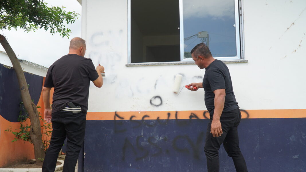 O vice-presidente da Assembleia Legislativa do Rio (Alerj), deputado estadual Guilherme Delaroli (PL-RJ), acompanhou nesta segunda-feira (10) o trabalho de limpeza e pintura de um prédio público recém-inaugurado no bairro São Joaquim, em Itaboraí, que havia sido pichado com referências ao Comando Vermelho e a um suposto traficante conhecido como “KN”.