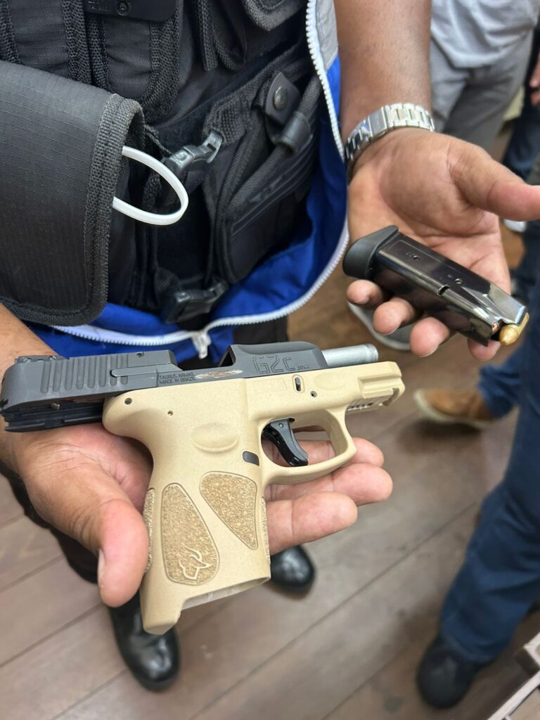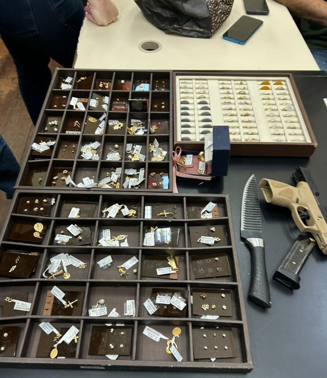 Com a dupla, os policiais apreenderam joias avaliadas em cerca de R$ 448 mil, além de uma pistola Taurus e uma faca de aproximadamente 40 centímetros.