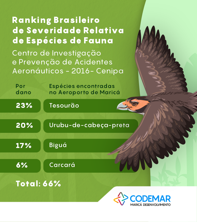 Entre as aves detectadas no estudo feito no Aeroporto de Maricá, estão a Tesourão, Urubu-de-cabeça-preta, Carcará e Biguá. Essas espécies, juntas, representam 66% de riscos de danos a aeronaves, segundo o Ranking Brasileiro de Severidade Relativa de Espécies de Fauna, publicado em 2016, pelo Centro de Investigação e Prevenção de Acidentes Aeronáuticos (Cenipa).