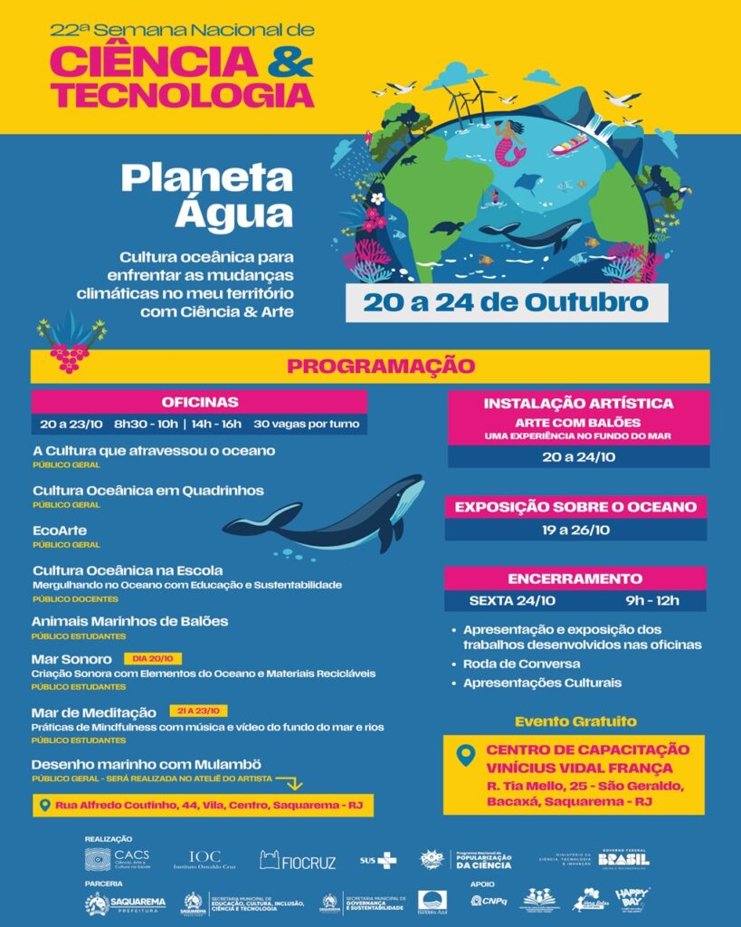 Integrando o calendário da 22ª Semana Nacional de Ciência e Tecnologia, promovida pelo Ministério da Ciência, Tecnologia e Inovação (MCTI), a edição saquaremense tem como tema “Planeta Água: Cultura Oceânica para Enfrentar as Mudanças Climáticas no Meu Território”. A proposta é unir ciência, arte e educação ambiental em uma programação interativa e voltada à preservação dos oceanos e à sustentabilidade.