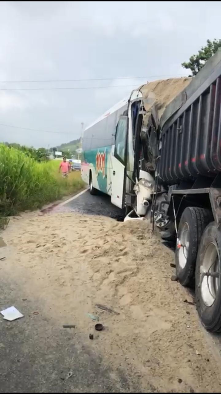 Uma colisão frontal entre um ônibus da Auto Viação 1001 e um caminhão que transportava areia complica o trânsito na Rodovia Amaral Peixoto (RJ-106), na altura de Sampaio Corrêa, em Saquarema. O acidente aconteceu no início da tarde desta sexta-feira (03).