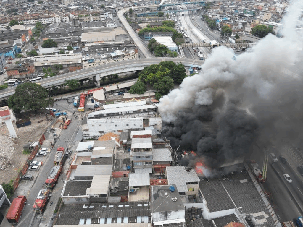 As chamas começaram nas primeiras horas do dia e se intensificaram rapidamente. Pouco depois das 7h, o fogo já alcançava imóveis vizinhos e parte da estrutura do galpão começou a ceder, espalhando destroços sobre construções próximas.