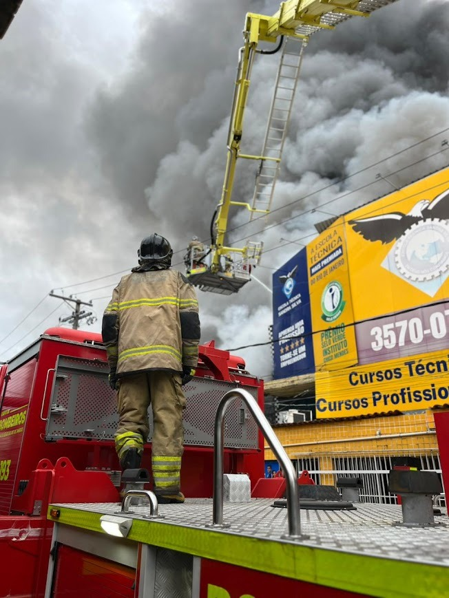 Equipes do Corpo de Bombeiros foram acionadas e, em determinado momento, precisaram recuar devido ao risco de desabamento e à força das chamas.