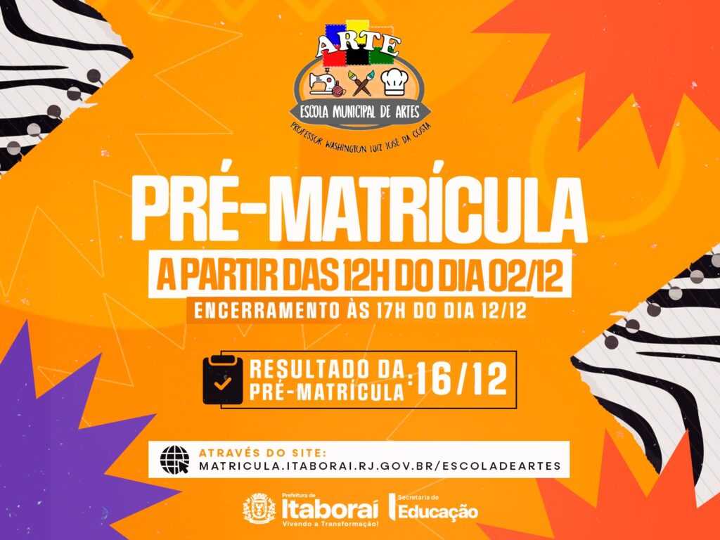 A Prefeitura de Itaboraí, por meio da Secretaria Municipal de Educação, informa que a pré-matrícula para os cursos da Escola Municipal de Artes Professor Washington Luiz José da Costa estará aberta das 12h do dia 2 de dezembro até às 17h de 12 de dezembro de 2025. As inscrições serão realizadas exclusivamente pela página:
