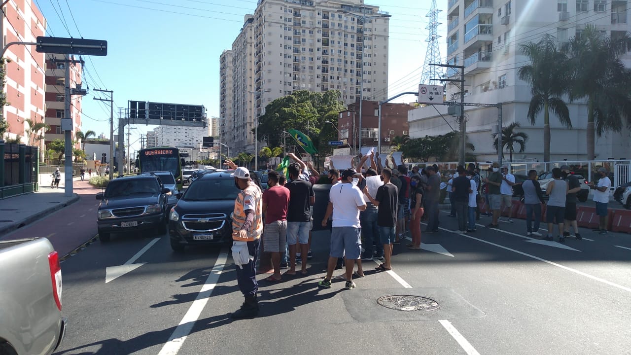 Com faixas e placas pedindo a reabertura do comércio, eles pararam o trânsito na Rua Roberto Silveira, em Icaraí, Zona Sul de Niterói. Uma carreata também segue do Museu de Arte Contemporânea (MAC) pelas ruas da cidade.