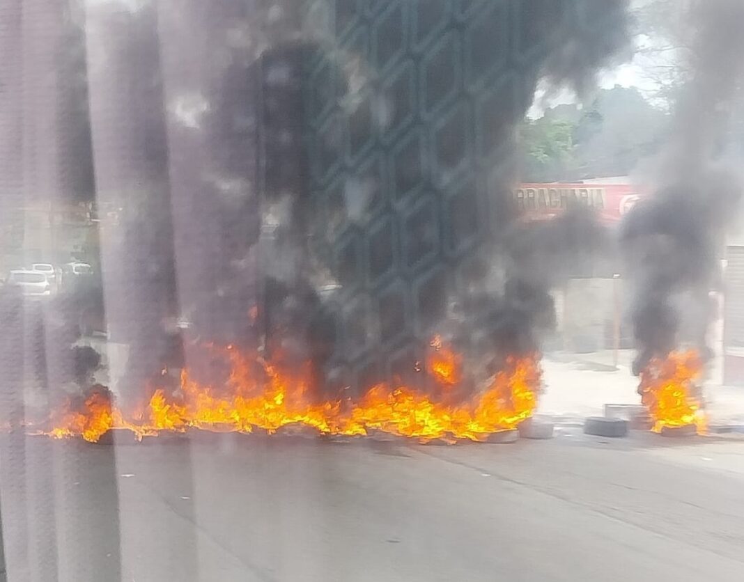 Policiais militares e equipes do Corpo de Bombeiros foram acionados para a RJ-106, na altura do bairro Rio do Ouro, em São Gonçalo, após manifestantes incendiarem pneus e interditarem as duas pistas da via.