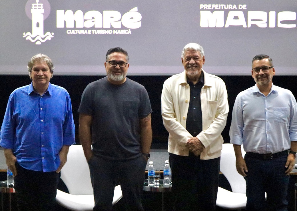 Da esquerda para a direita: secretário de Cultura e das Utopias, Sady Bianchin; secretário de Governo, Arlen Pereira; presidente da Maricá, Arte, Roteiro e Experiências (MARÉ), Antônio Grassi; e secretário de Turismo, Comércio, Indústria e Mercado Interno, José Alexandre Almeida. Foto: Matheus Oliveira / Errejota Notícias.