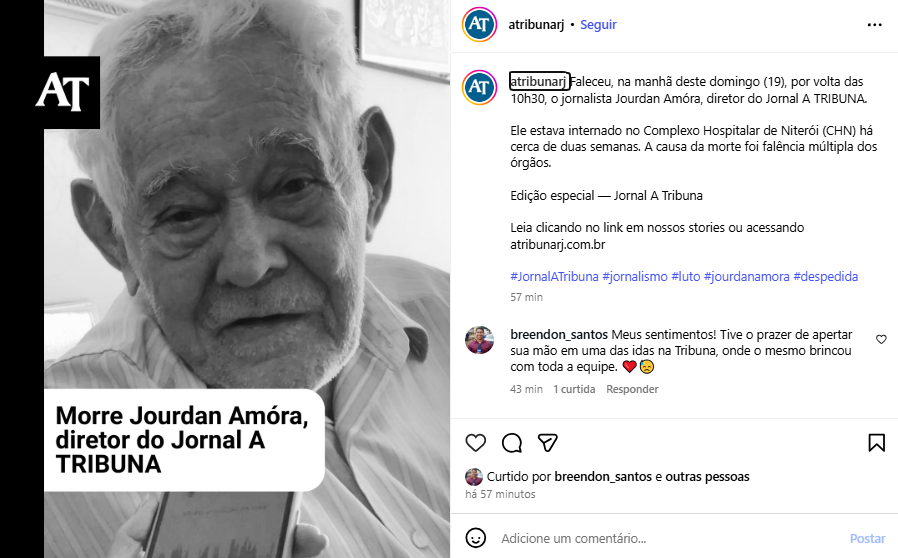 O jornalista e diretor do jornal “A Tribuna”, Jourdan Amóra morreu na manhã deste domigo (19) aos 87 anos, em Niterói, Região Metropolitana do Rio.