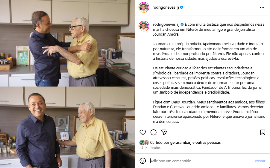 “É com muita tristeza que nos despedimos nessa manhã chuvosa em Niterói de meu amigo e grande jornalista Jourdan Amóra. Jourdan era a própria notícia. Apaixonado pela verdade e inquieto por natureza, ele transformou o ato de informar em um ato de resistência e de amor profundo por Niterói. Ele não apenas contou a história de nossa cidade, mas ajudou a escrevê-la.”, declarou Neves.