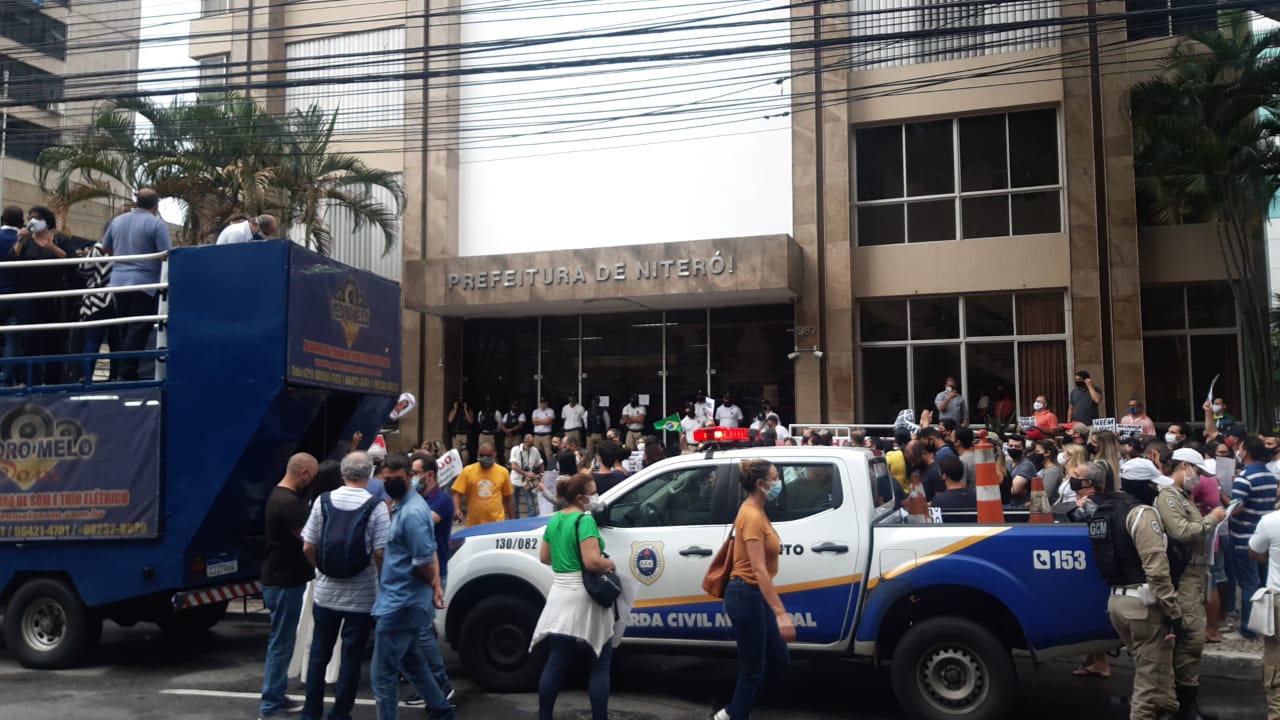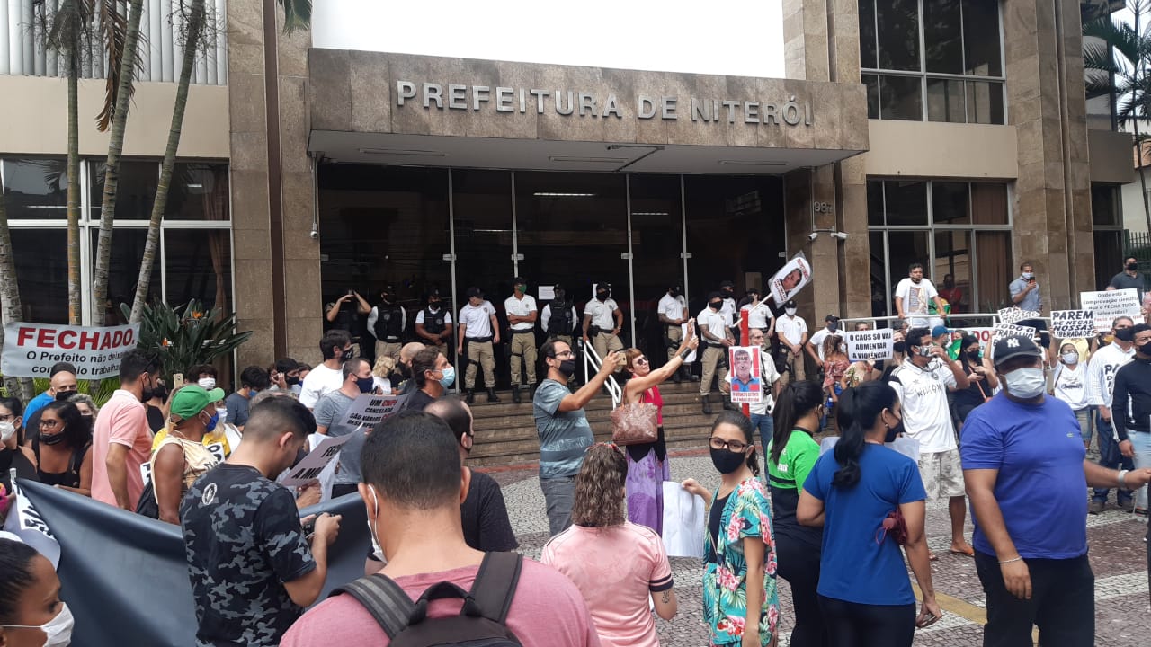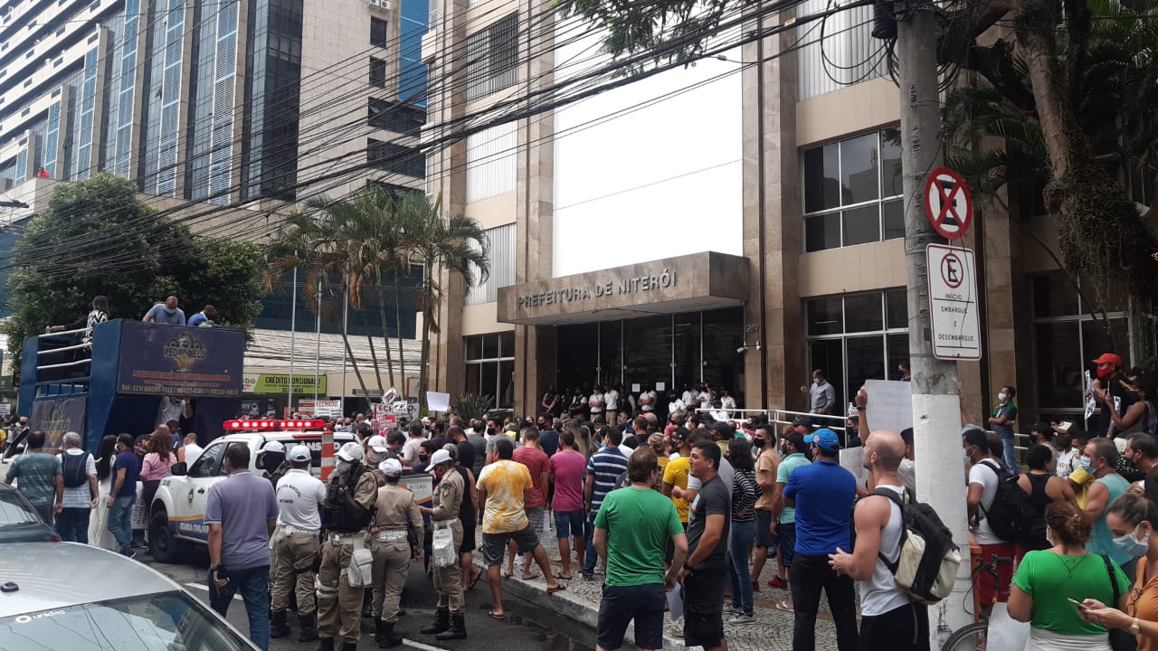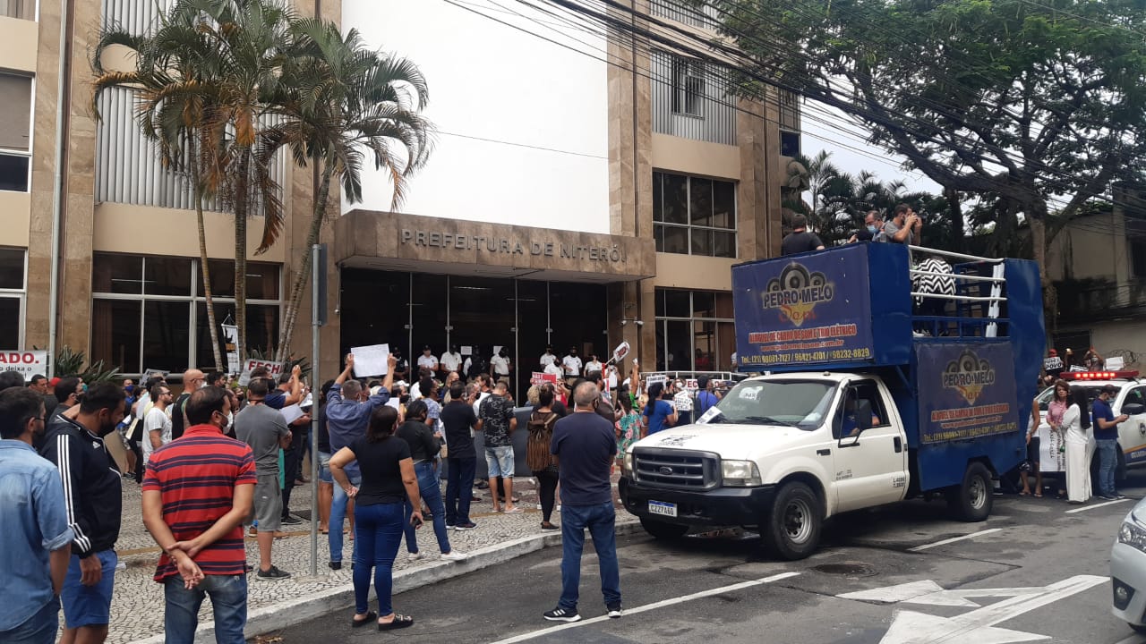 Centenas de manifestantes realizaram um protesto em Niterói nesta terça. Eles pedem a suspensão das medidas que restringem o funcionamento de atividades consideradas “não-essenciais” no município.