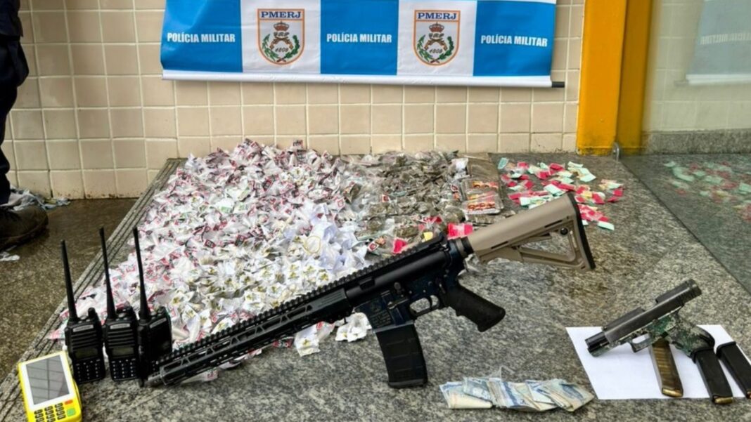 Com o suspeito e em pontos da comunidade, foram apreendidos um fuzil calibre 5.56, uma pistola 9mm, munições de ambos os calibres, além de grande quantidade de drogas — entre cocaína, maconha e crack. Também foram recolhidos três rádios comunicadores, carregadores de pistola, uma máquina de cartão e dinheiro em espécie.