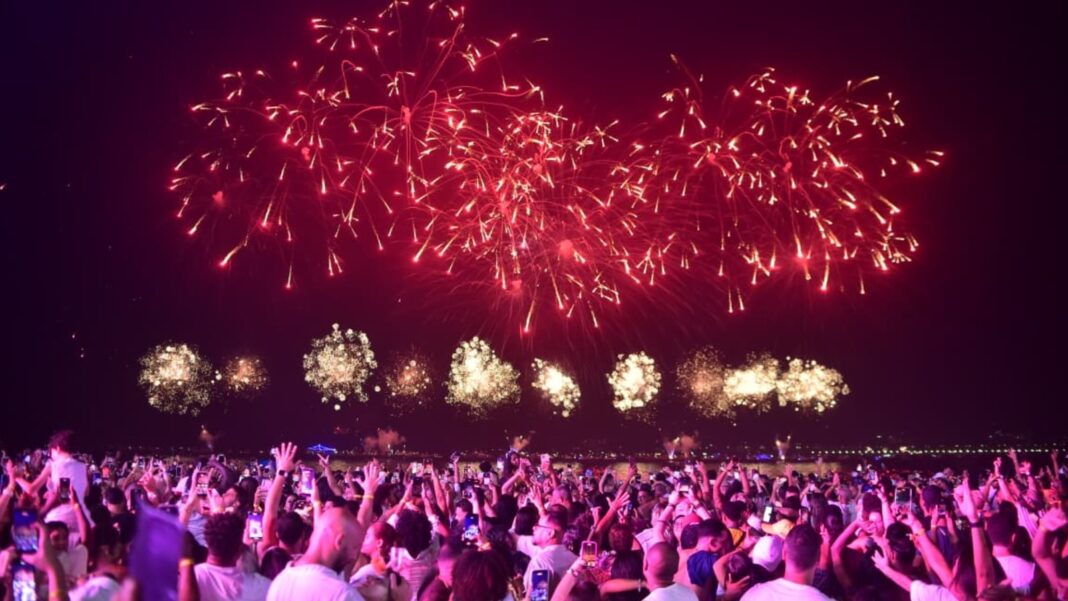 O samba tomou conta da areia com a energia da Unidos do Viradouro, que levou ao palco o intérprete Wander Pires, preparando o público para a tradicional contagem regressiva.