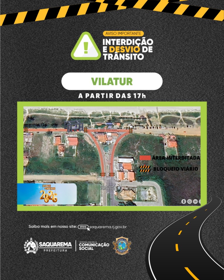 Vilatur – A partir das 17h dos dias 30 e 31 as interdições serão no trecho da Avenida Beira Mar, próximas ao Posto de Saúde do bairro. Importante frisar que, durante o dia, o trânsito estará livre no trecho da Avenida Nova Saquarema.