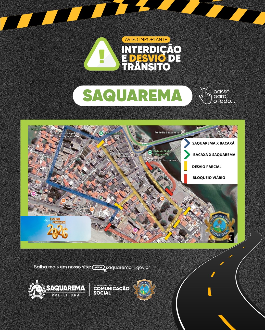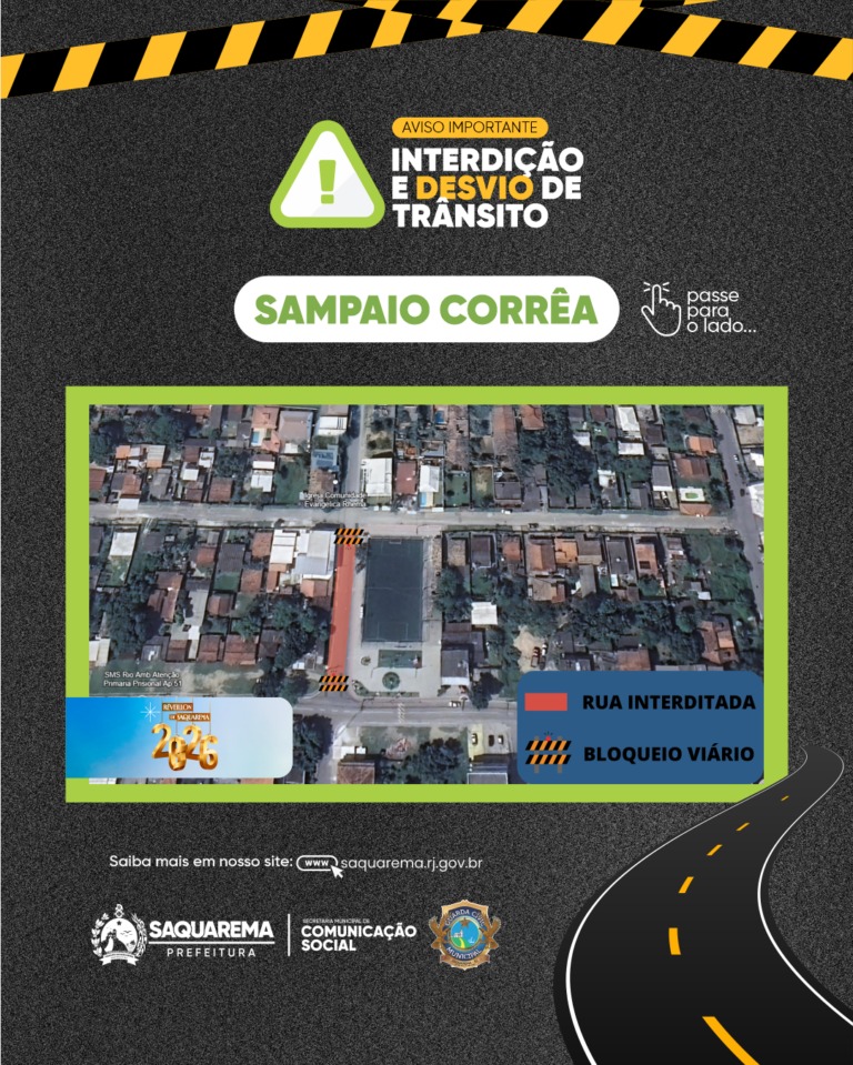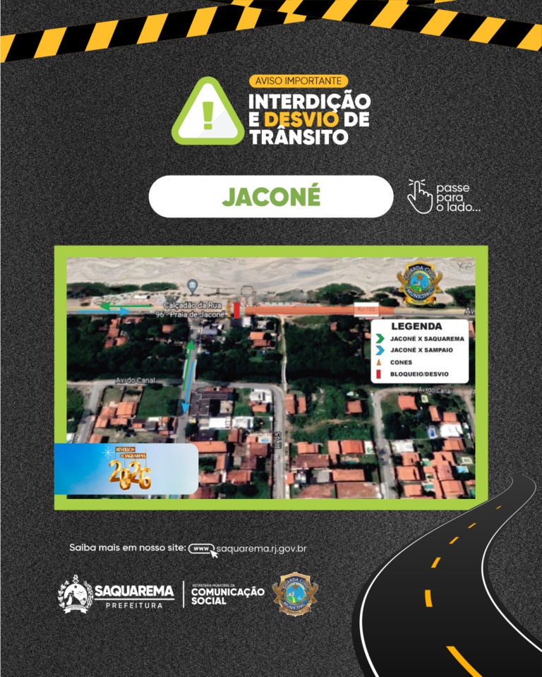 O trânsito da cidade passará por alterações temporárias em razão das festas de Réveillon realizadas nos distritos de Saquarema, Vilatur, Sampaio Corrêa e Jaconé. As mudanças foram definidas pela Guarda Civil Municipal com o objetivo de garantir mais segurança aos pedestres e melhor fluidez do tráfego durante os eventos.