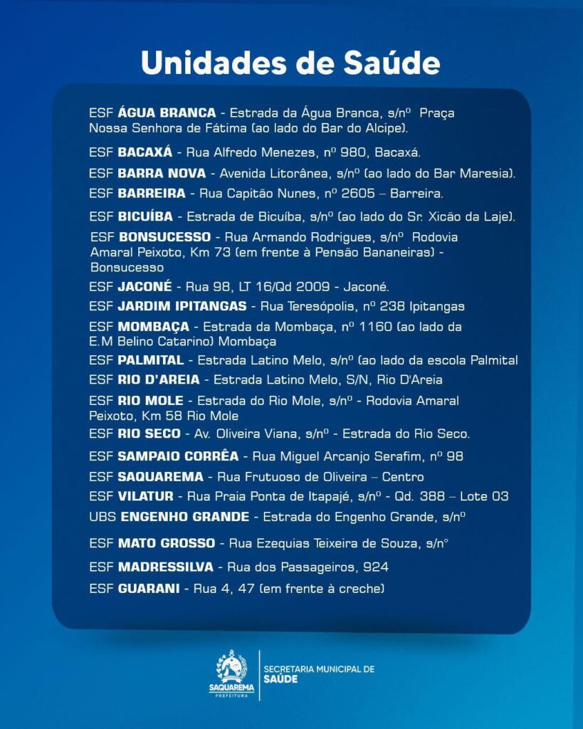 A vacinação estará disponível em todas as unidades de Estratégia de Saúde da Família (ESF), distribuídas por bairros como Bacaxá, Barra Nova, Jaconé, Sampaio Corrêa, Rio d’Areia, Vilatur e Bonsucesso, das 9h às 16h. A única exceção é a unidade de Engenho Grande, que funcionará das 9h às 12h.