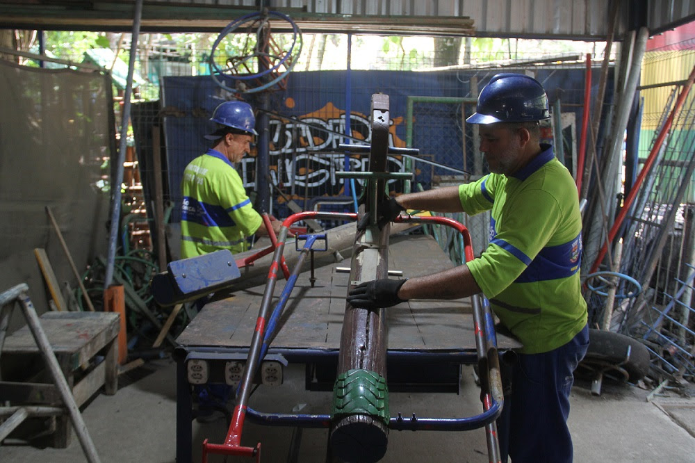 Os reparos são realizados no Horto Municipal, localizado no bairro Água Mineral, onde uma equipe especializada em serralheria e carpintaria atua na recuperação de brinquedos e bancos de madeira danificados. Quando um equipamento apresenta problemas, ele é recolhido e encaminhado ao local, onde passa por avaliação técnica para definição do reparo ou, se necessário, da substituição por um novo item.