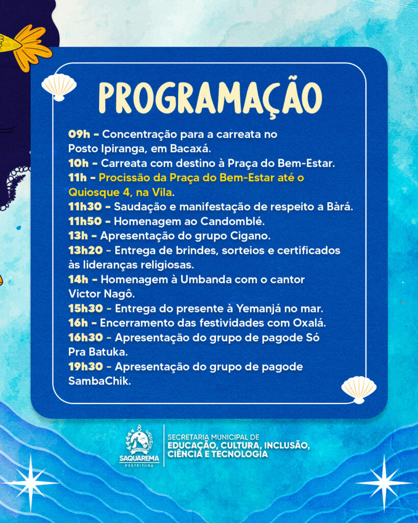 A programação começa às 9h, com a concentração para a carreata no Posto Ipiranga, em Bacaxá, que segue às 10h em direção à Praça do Bem-Estar. Às 11h, acontece a procissão até o Quiosque 4, na Vila, onde serão realizadas saudações a Bàrá e uma homenagem ao Candomblé. Durante a tarde, o público poderá acompanhar a apresentação do Grupo Cigano, além da entrega de brindes, sorteios e certificados às lideranças religiosas.
