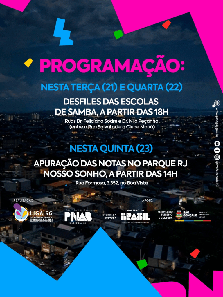 A cidade de São Gonçalo dá início nesta terça-feira (21) ao aguardado Carnaval da Retomada 2026, marcando um momento histórico com o retorno oficial dos desfiles das escolas de samba após mais de uma década sem uma realização estruturada. A programação acontece no Centro da cidade nesta terça (21), feriado de Tiradentes, e quarta-feira (22), com apuração marcada para quinta-feira (23), feriado de São Jorge, no Parque RJ Nosso Sonho.